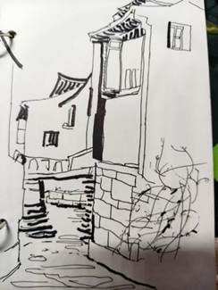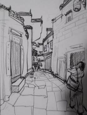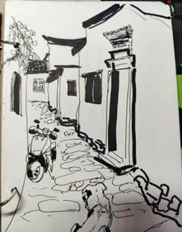 考察活动按计划有序推进。师生首站抵达宏村,南湖的波光粼粼、月沼的静谧清幽与马头墙的错落有致,成为天然的绘画课堂,大家用画笔、相机、手机定格徽派建筑“粉墙黛瓦、依山傍水”的独特韵味。天井的光影变幻以及潺潺溪流的灵动姿态,尽数纳入画稿之中。