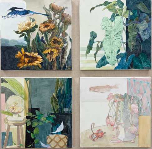 美术系展出画作57件幅,涵盖油画、国画、版画、水彩四大门类。参展作品风格多样、特色鲜明,油画色彩厚重、肌理丰富,尽显写实与抒情张力;国画以笔墨传情,融写意精神与地域风貌,线条灵动;版画通过刀刻肌理与套印技法,兼具叙事性与形式美;水彩则以通透笔触勾勒意境,展现独特艺术表达。